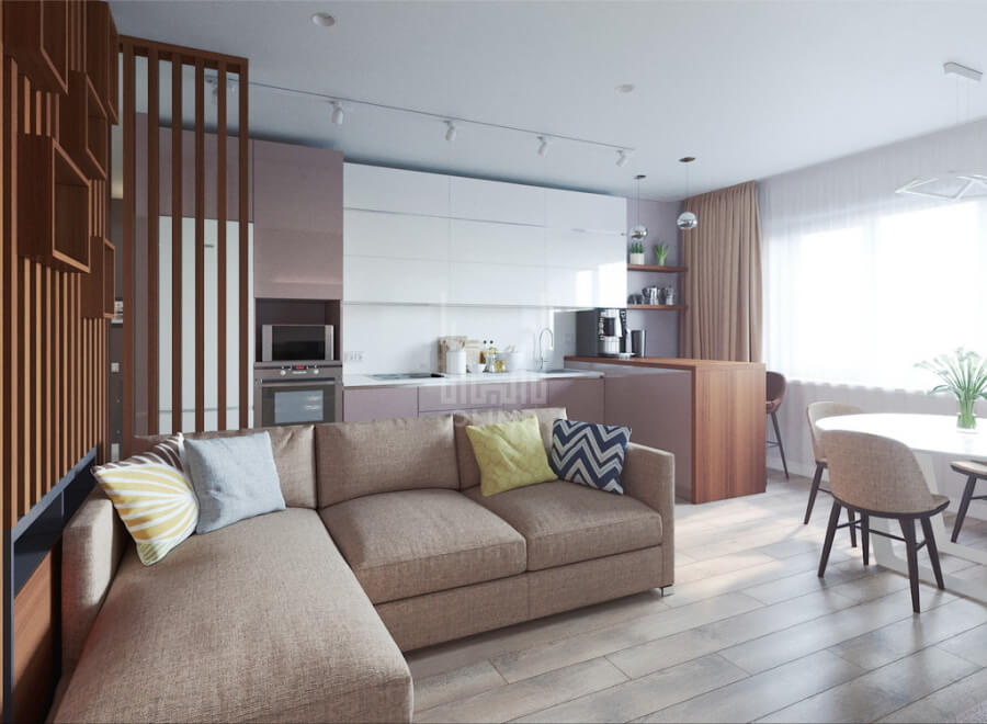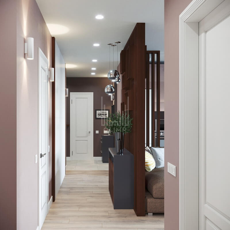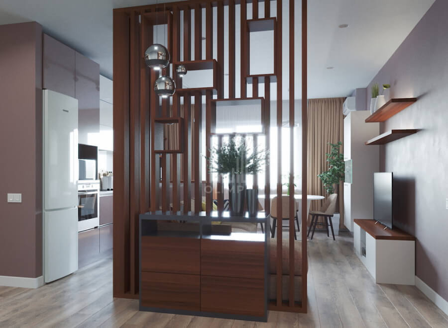 Эстетическим центром всего проекта является декоративная перегородка, выполненная из деревянных реек от пола до потолка и интегрированные в нее полки для растений в верхней части, а в нижней - закрытая зона хранения, которая одновременно эстетический и функциональный элемент интерьера, объединяющий коридор и кухню-гостиную.