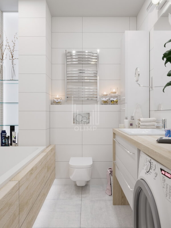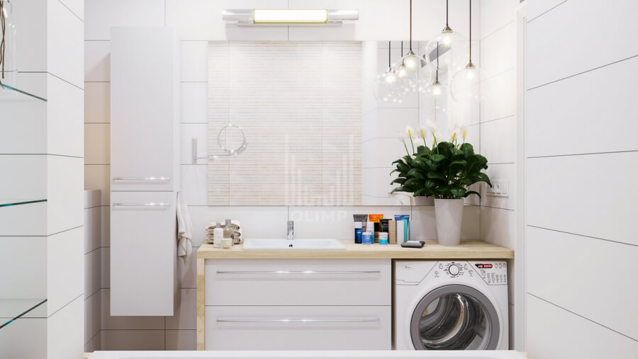 Была увеличена ванная за счет коридора, благодаря чему удалось эргономично вписать мебель и сантехнику.
